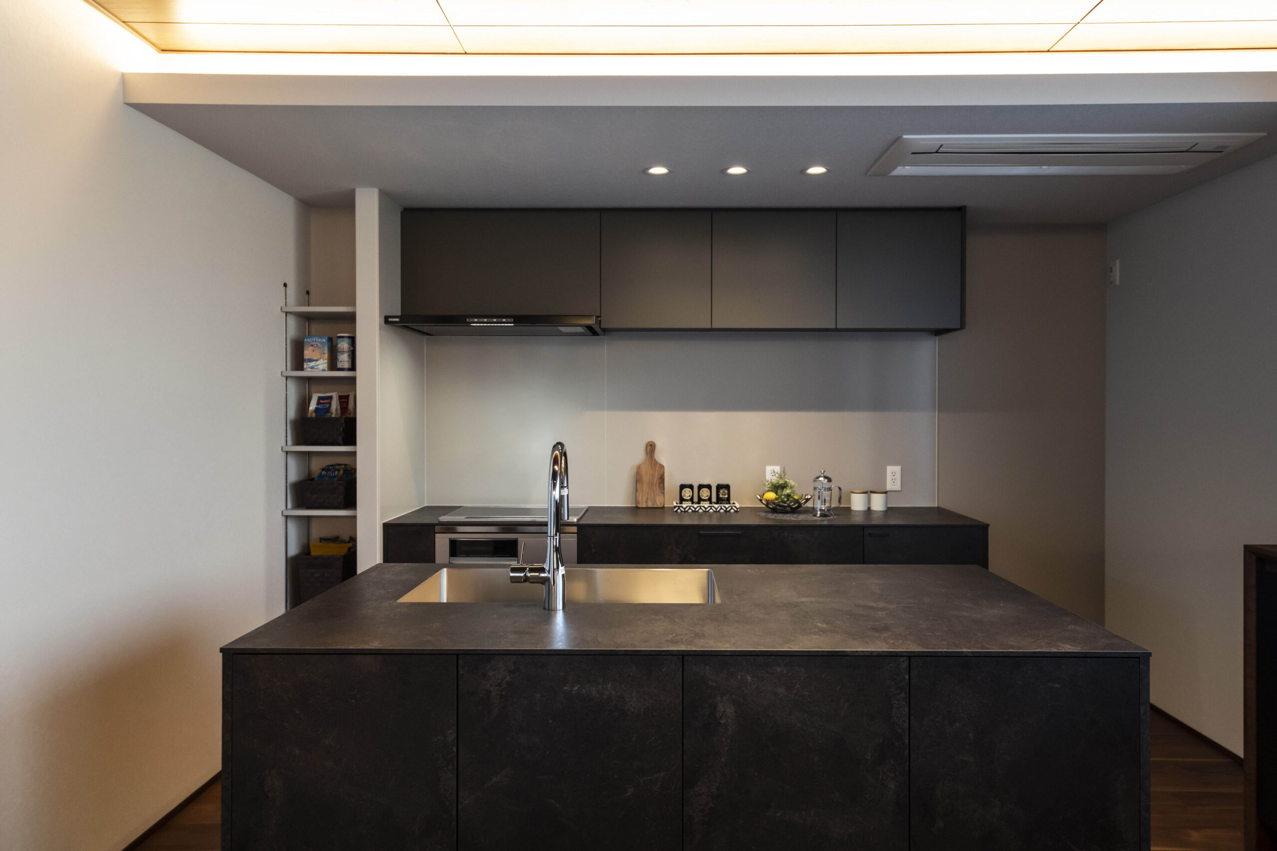 また、アイランドのダイニング側にも収納を設け、キッチン以外のモノも収納できるようになっています。