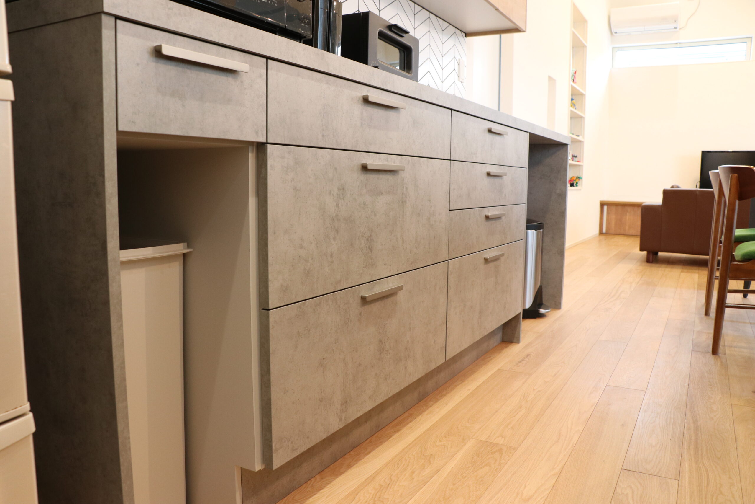 壁面収納の両サイドにはあえてオープンスペースを設け、片側はゴミ箱専用、もう一方は椅子を置いて家事作業ができるスペースとして活用できるようにしました。機能性と使い勝手に配慮した設計です。