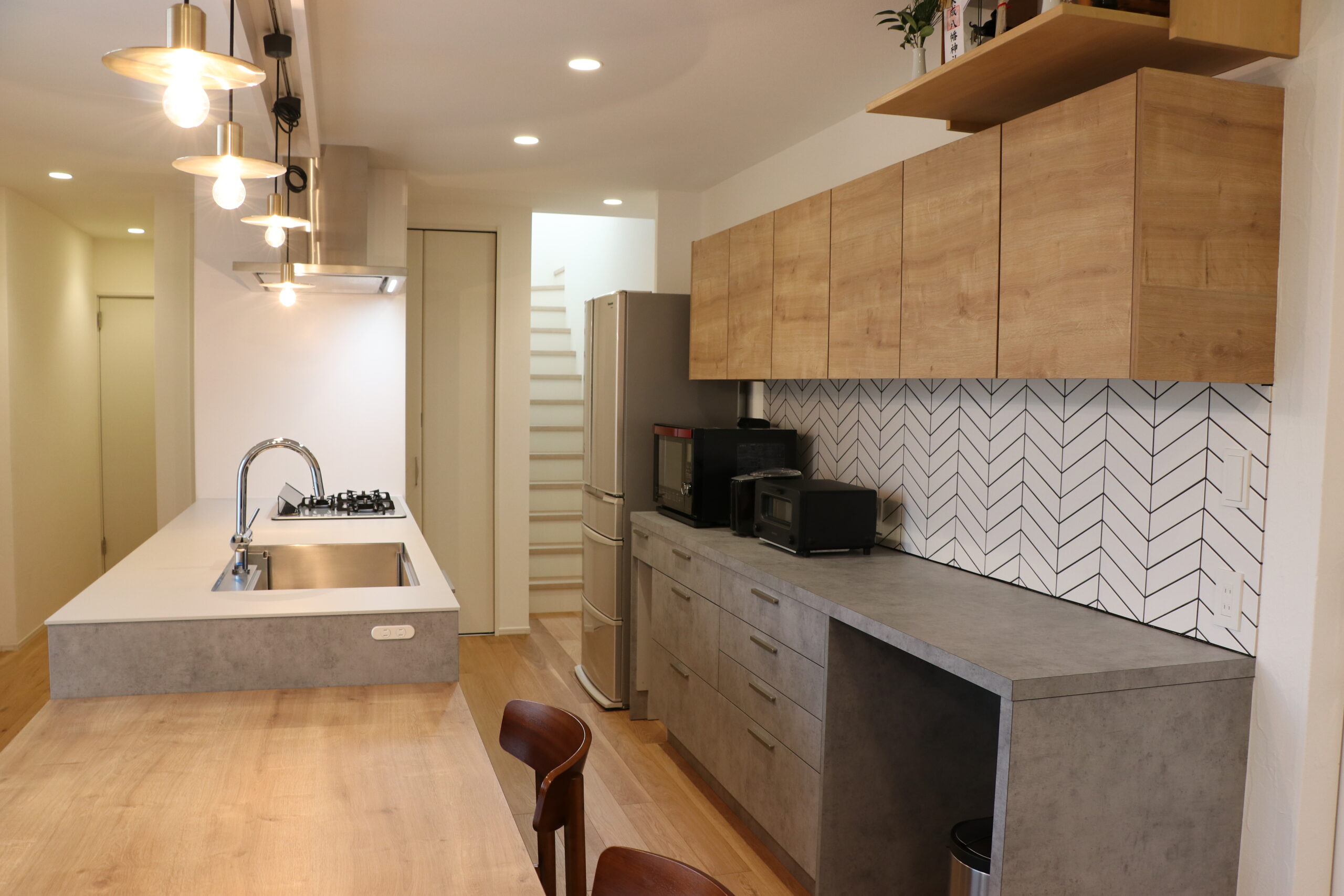「既成品やセミオーダーでは叶わない理想」を細部まで反映し、ついに完成したのは、北欧デザインを取り入れたスタイリッシュでありながら温かみのあるキッチン。素材の個性を活かした空間に、吊り下げタイプの照明がアクセントとなり、ナチュラルでお洒落な雰囲気を演出しています。