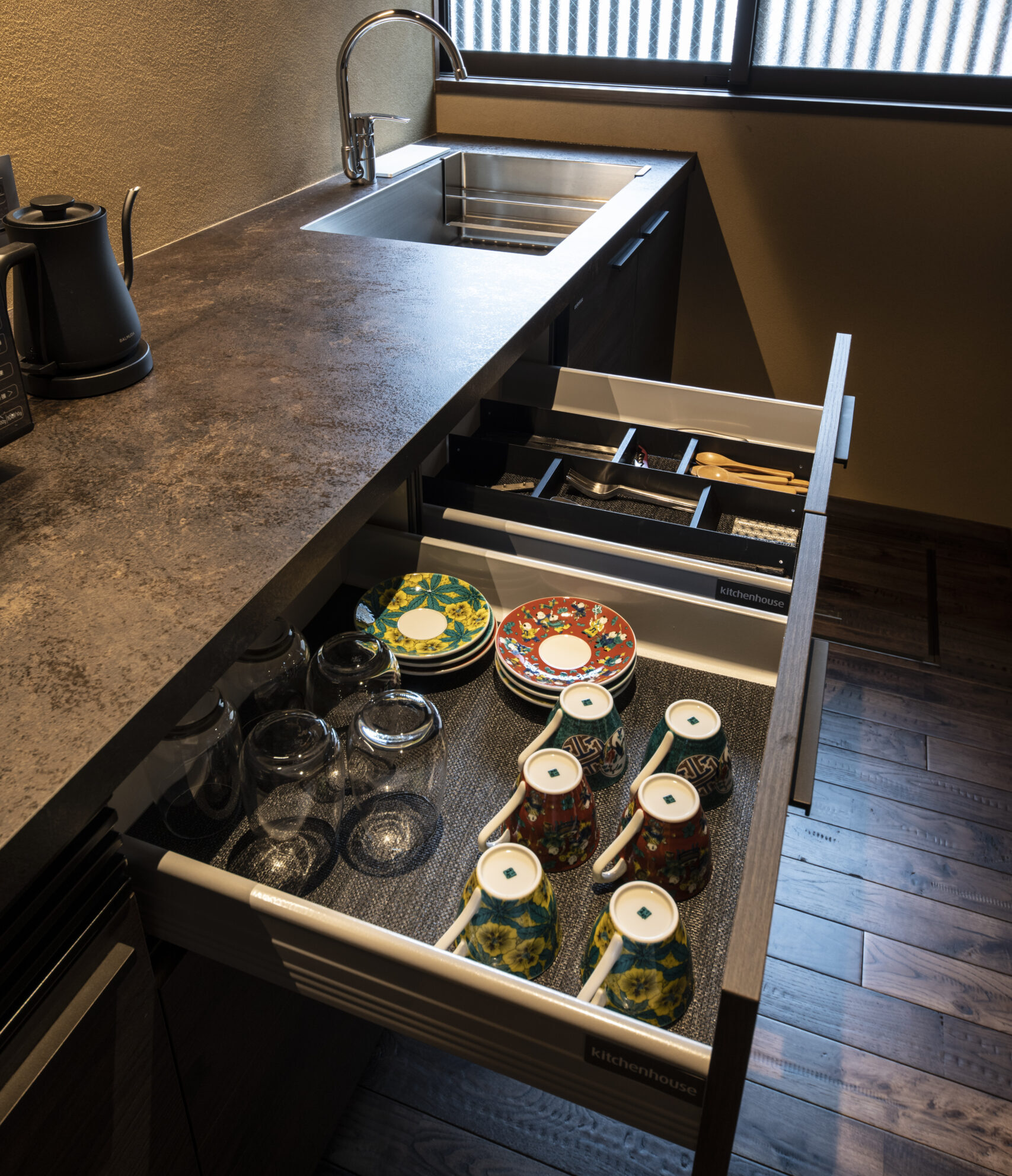 キッチン内に、食器や卓上IH、冷蔵庫をすっきりと収納できるキッチンをご希望でした。
