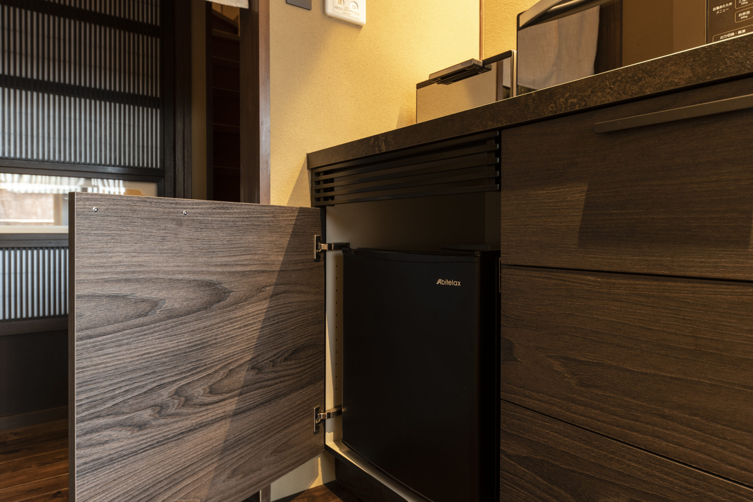 キッチンにはシンクを設けつつ、ビルトインコンロは採用せず卓上コンロを使用されるため、専用の引き出しを設計しました。さらに、ミニ冷蔵庫もキッチン内に収め、外観を損なわないようルーバーをオリジナルで製作。機能性とデザイン性を両立した仕上がりとなっています。