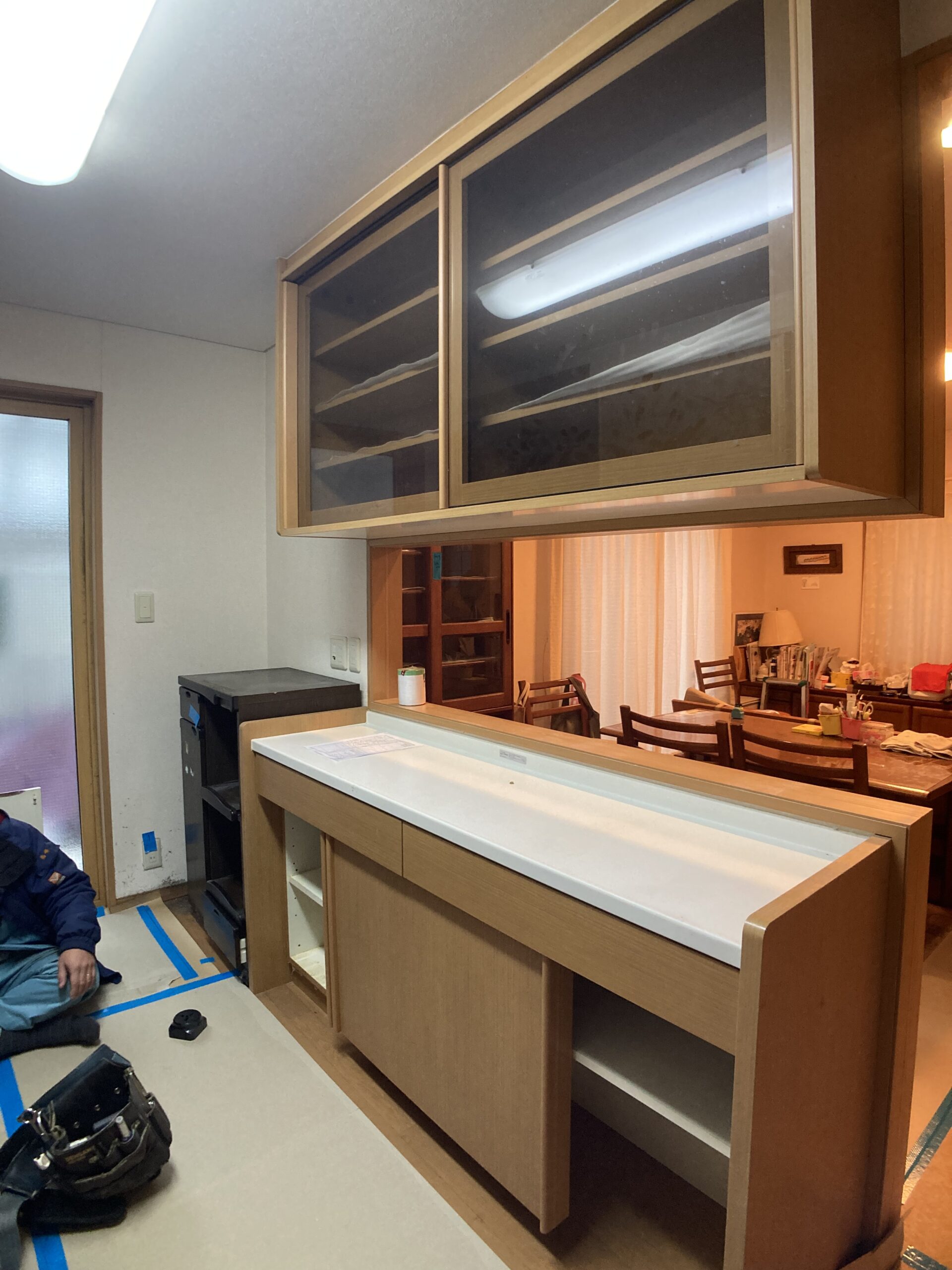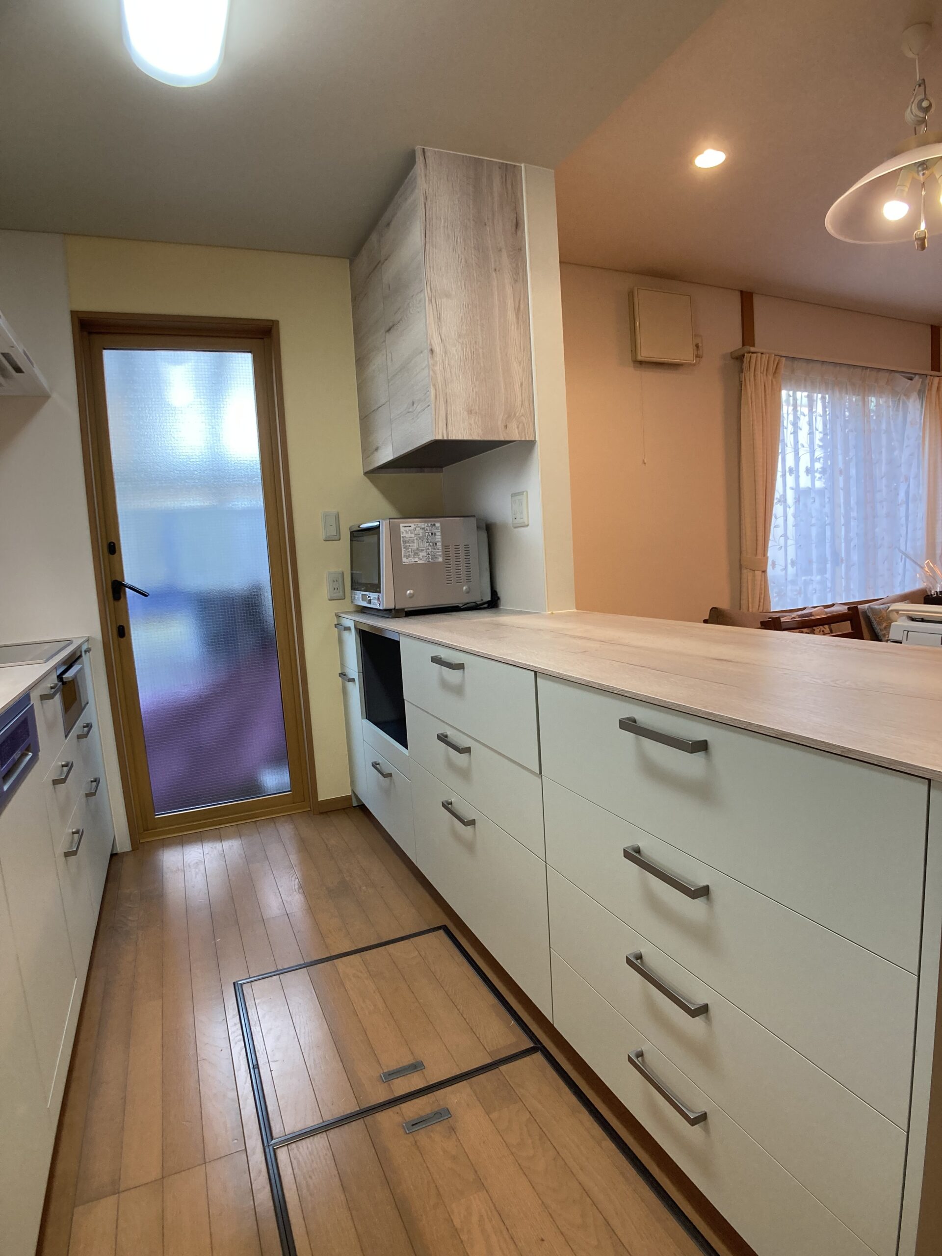 これまで雑然と家電等が置かれていたスペースはカウンターを伸ばし吊戸棚を設置。