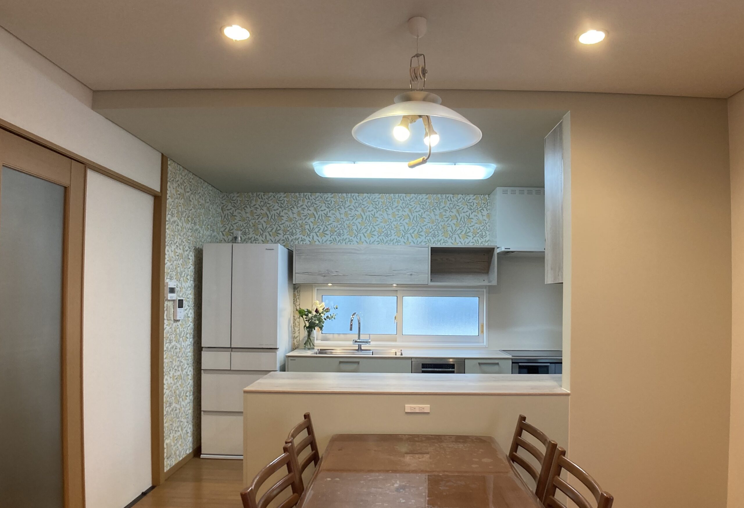 ダイニングから見えるキッチンの壁面に、お気に入りのモリスの壁紙を施工しました。サンプルを取り寄せ、キッチンの扉材と合わせて確認しました。壁の一部を模様のあるクロスにすると、お部屋に変化が出て雰囲気を楽しめます。お気に入りのキッチン空間となりました。
